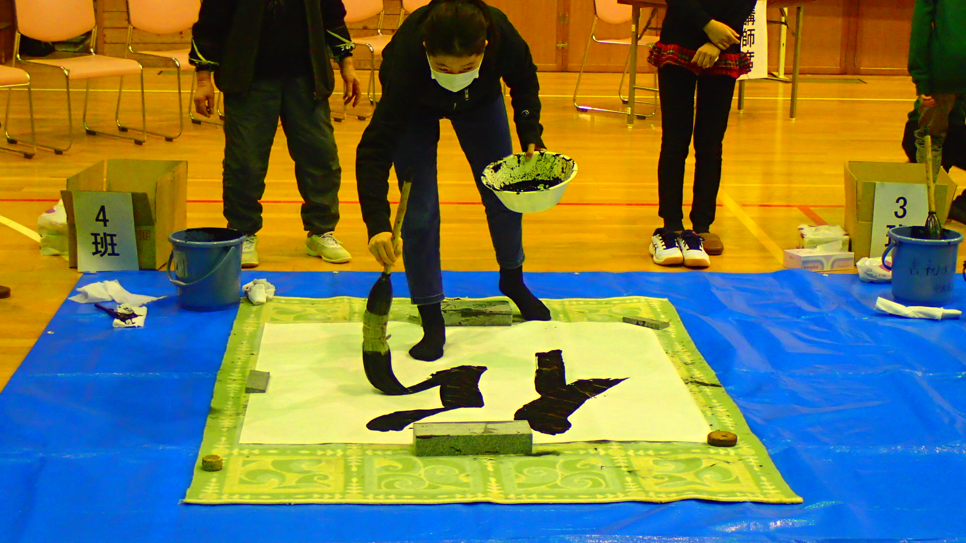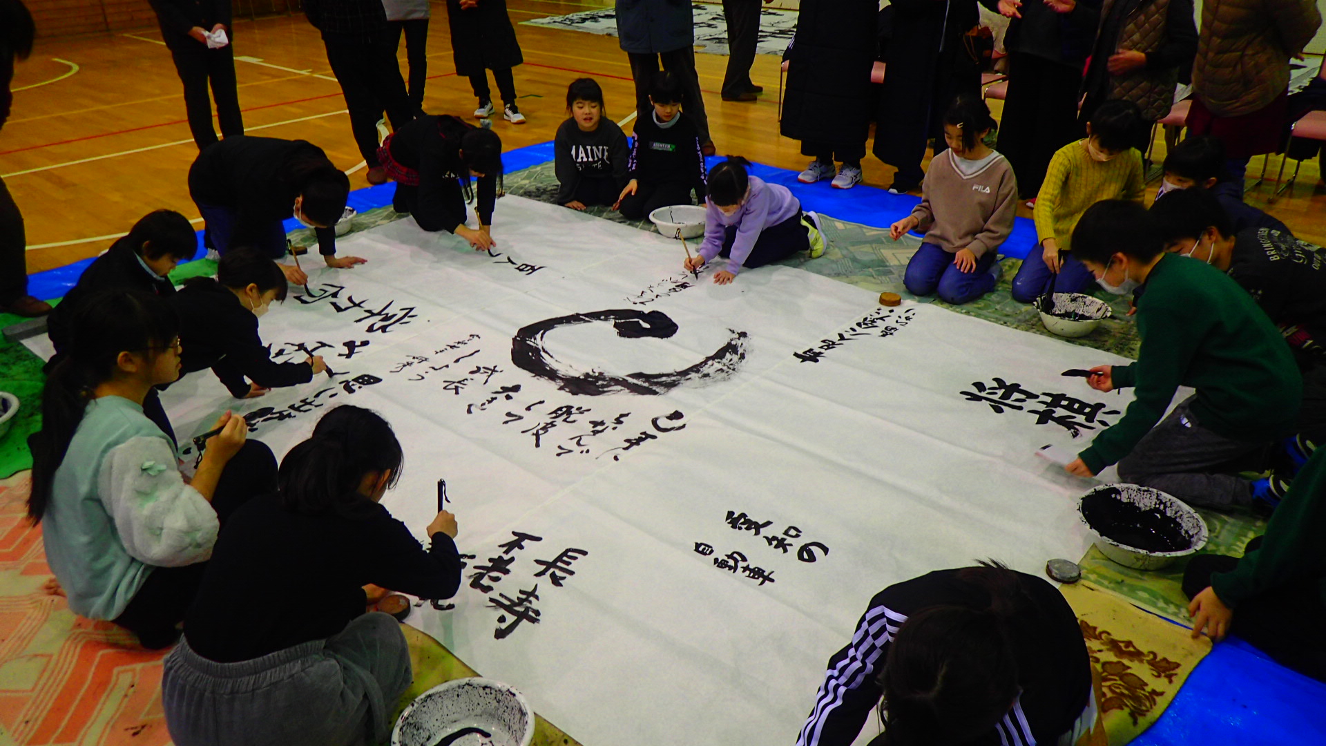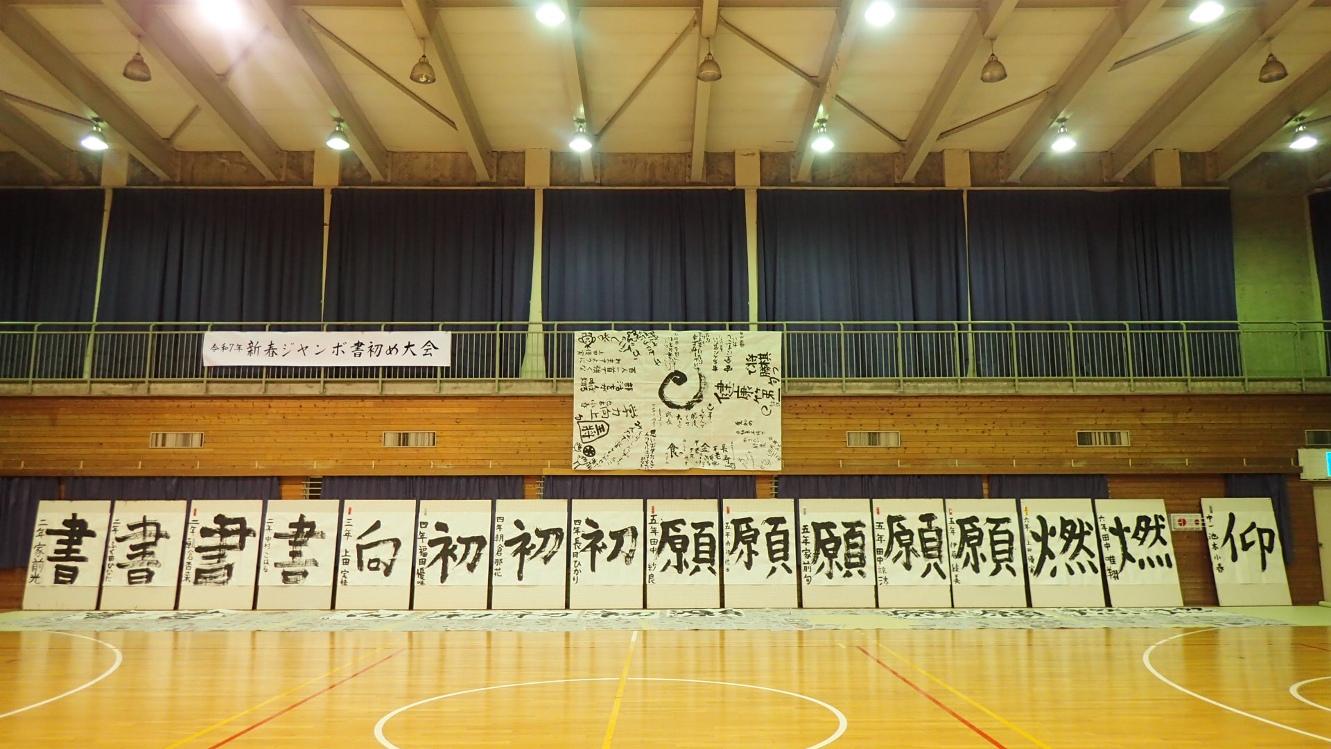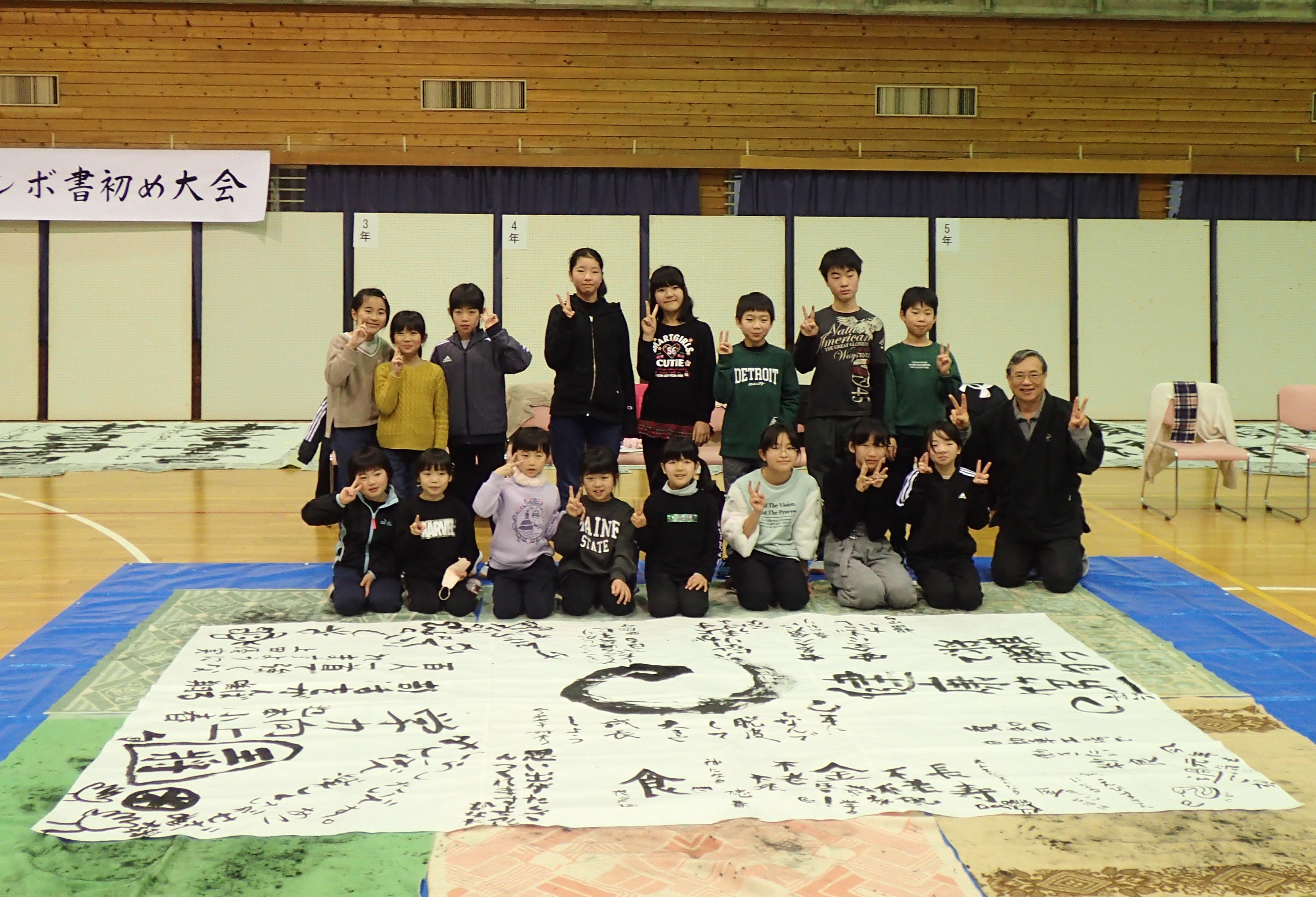 1月12日(日)、今年で34回目となる「令和7年新春ジャンボ書初大会」を村岡体育館で開催しました。村岡区・小代区内の小・中学生16名が参加し、大筆を使って120cm角の画仙紙いっぱいに、力強い元気あふれる字を書きました。