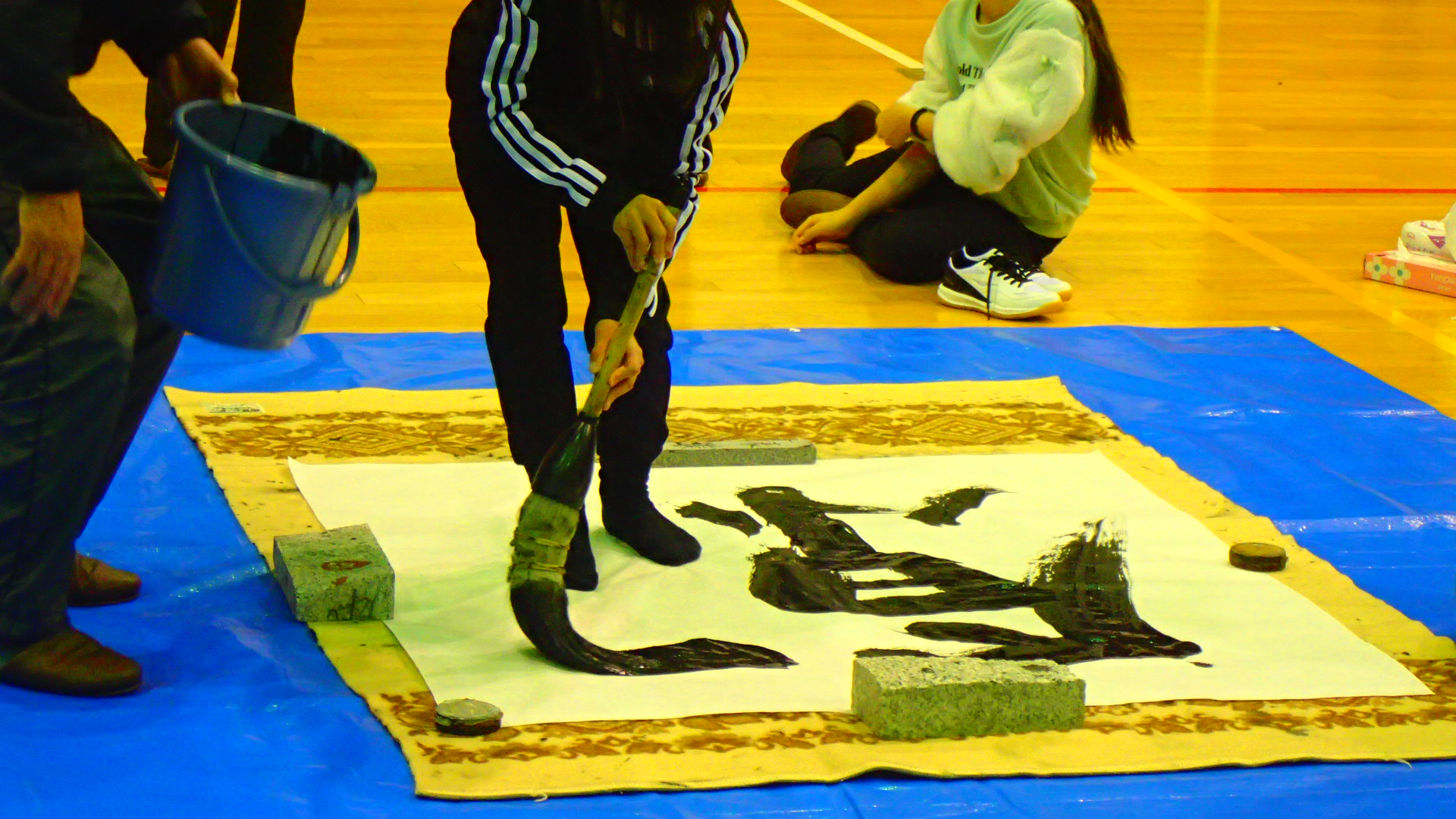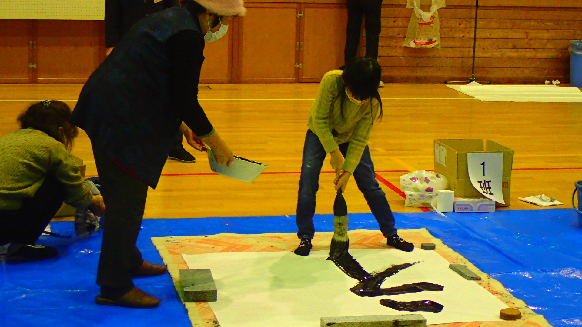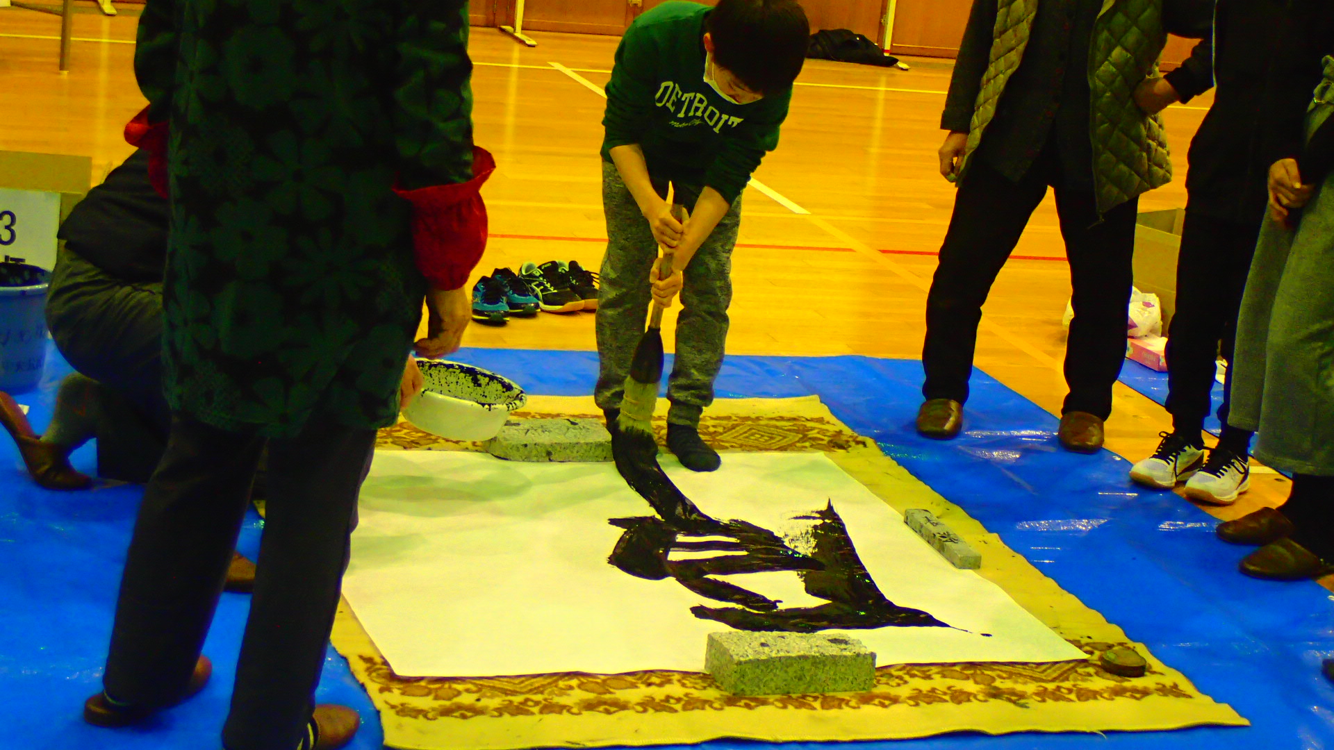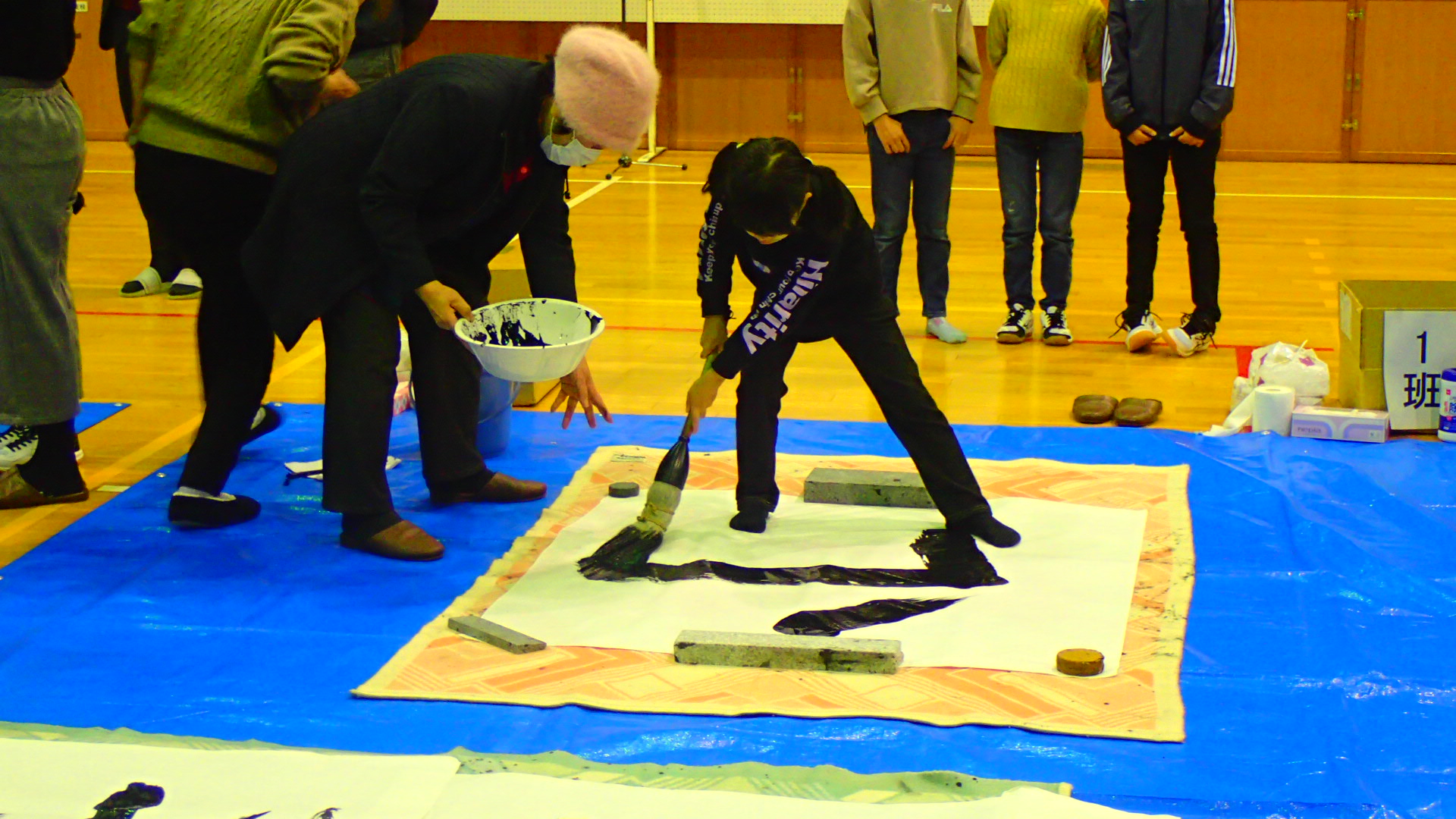 1月12日(日)、今年で34回目となる「令和7年新春ジャンボ書初大会」を村岡体育館で開催しました。村岡区・小代区内の小・中学生16名が参加し、大筆を使って120cm角の画仙紙いっぱいに、力強い元気あふれる字を書きました。