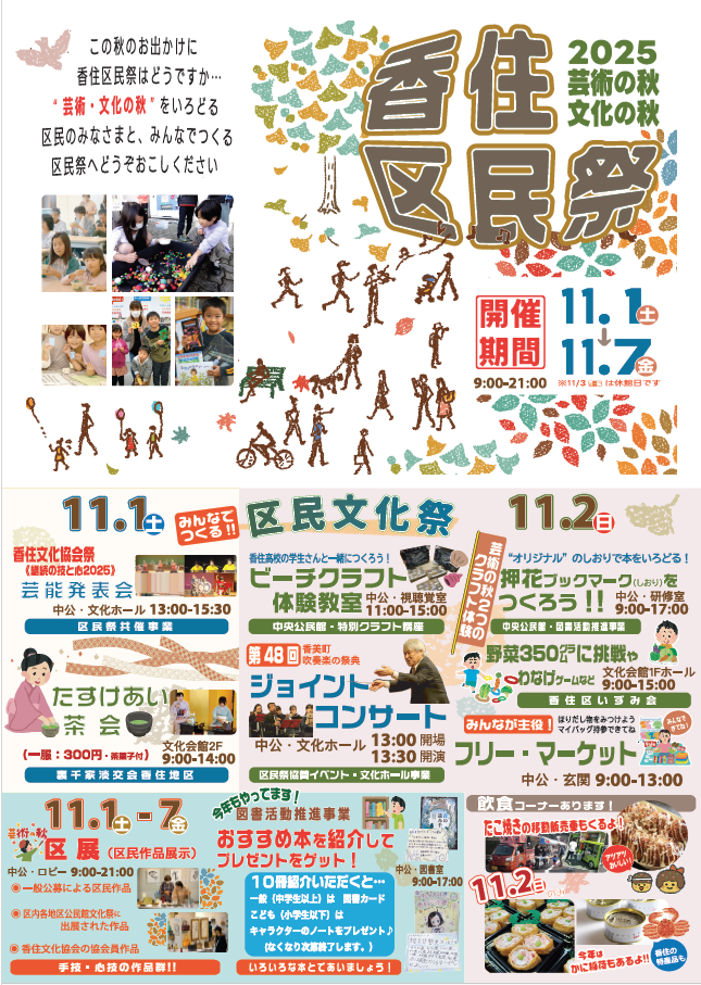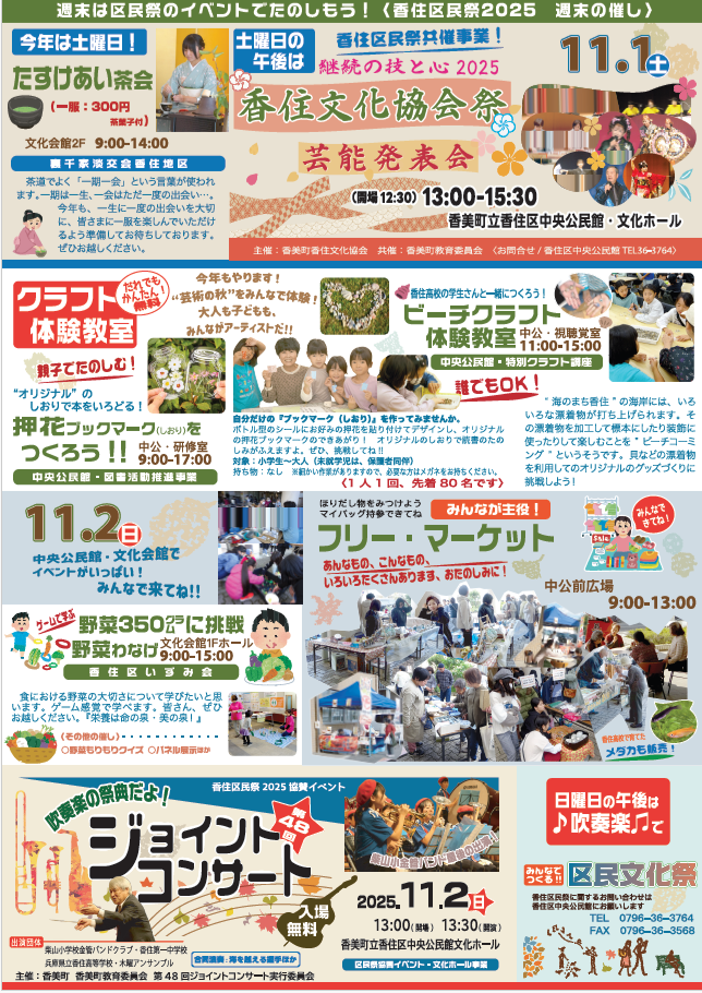 ○香住区民祭2025共催イベント 香住文化協会『芸能発表会』 【香住区中央公民館:文化ホール】 12:30開場、13:00開演~15:30 入場料:無料 “継続の技と心” 踊りや歌、琴などたのしい演目で皆さまをお待ちしています。 11月2日(日)○フリー・マーケット 【香住区中央公民館:玄関前付近】 9:00~13:00 ※荒天時は、文化会館の3階で実施します。