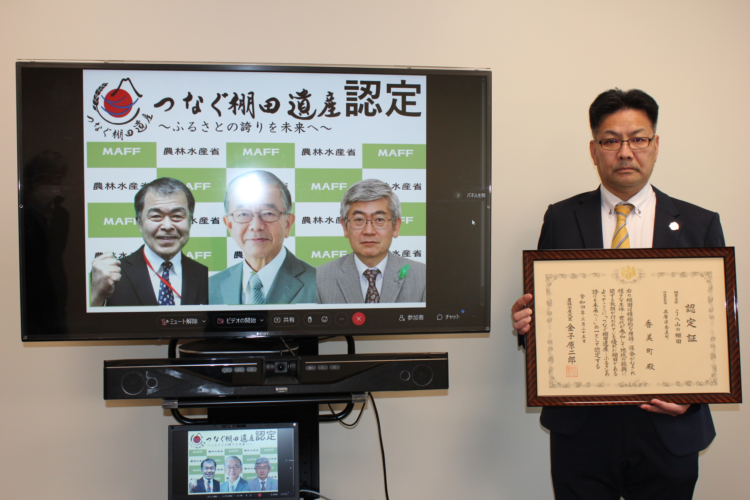 令和4年3月25日に農林水産省でオンラインによる認定式が行われ、令和4年3月29日に神戸市で認定証授与式が行われました。