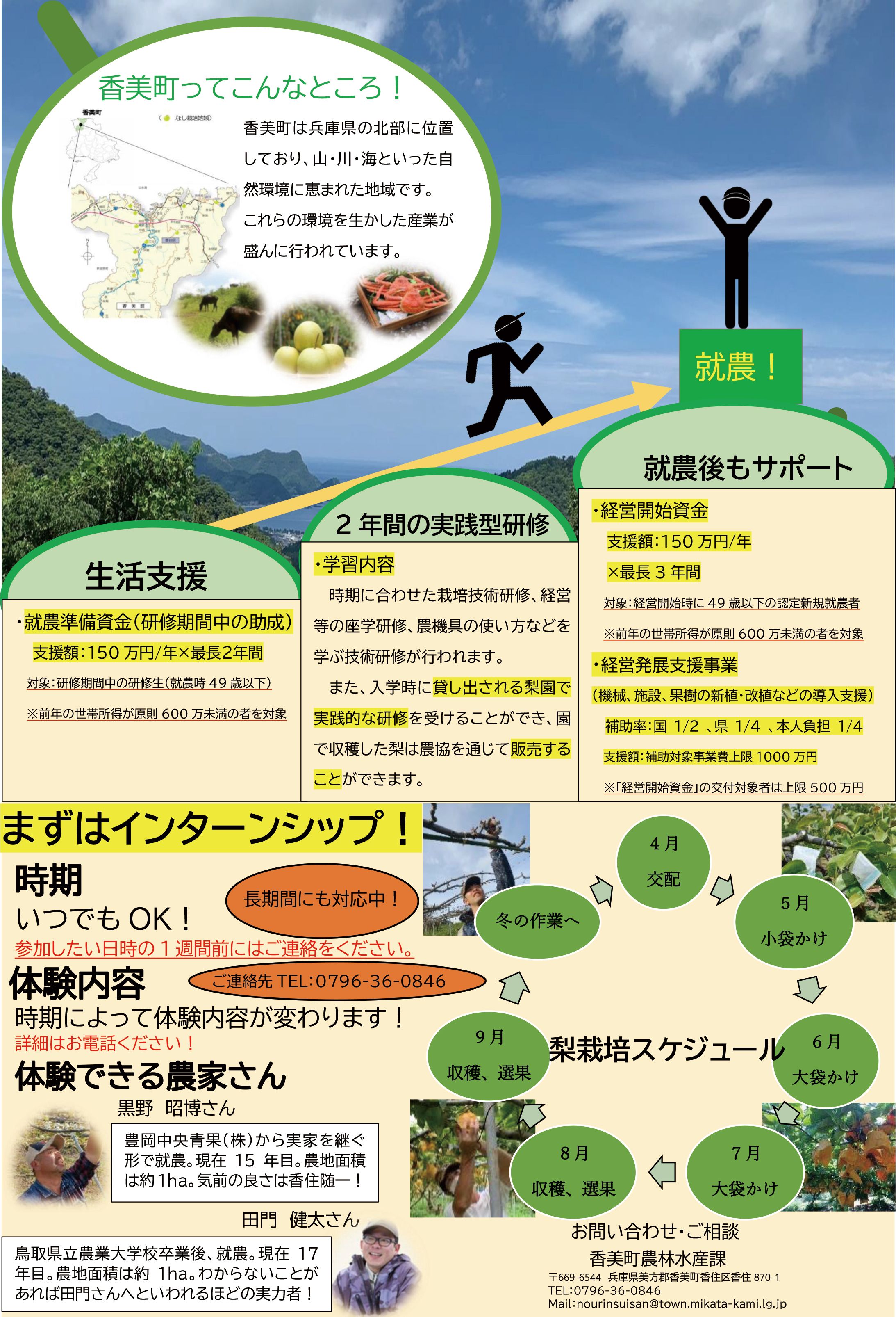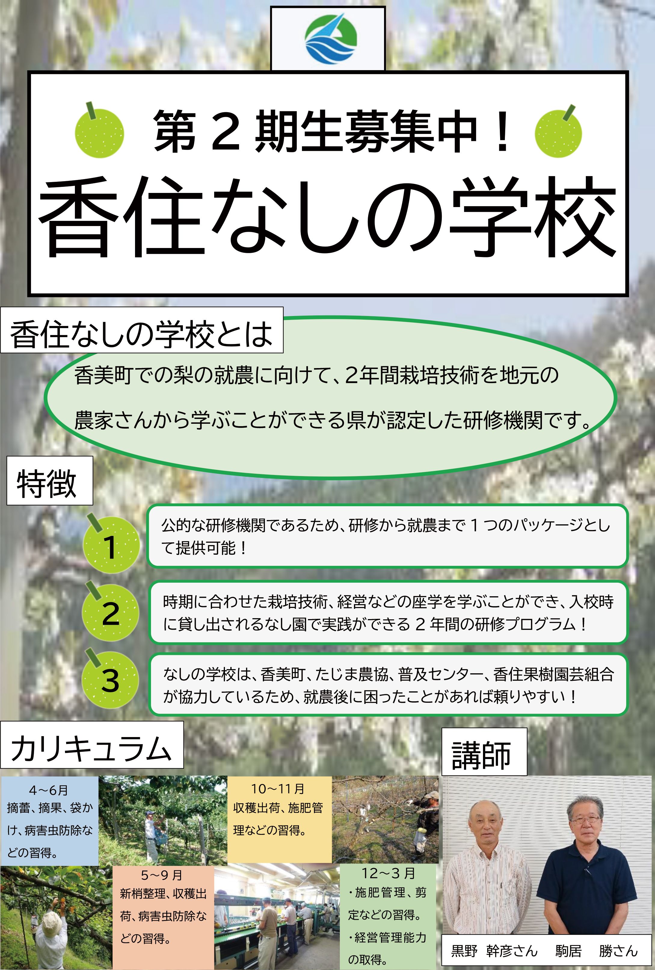香美町では、梨の生産技術と園地の継承を行い、町内で独立就農を目指す新規就農希望者を「香住なしの学校」の研修生として募集します。