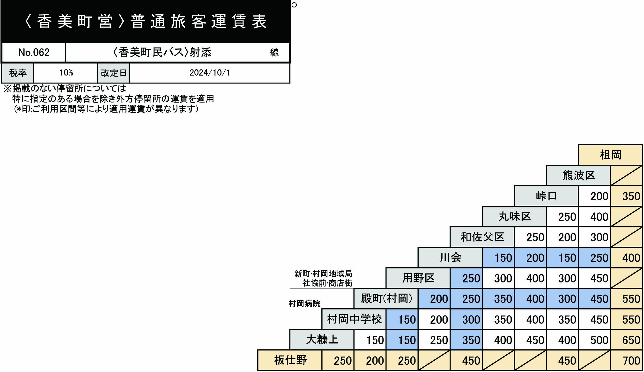 香美町民バス射添線につきまして、令和6年10月から料金を下表のとおり変更する予定です。