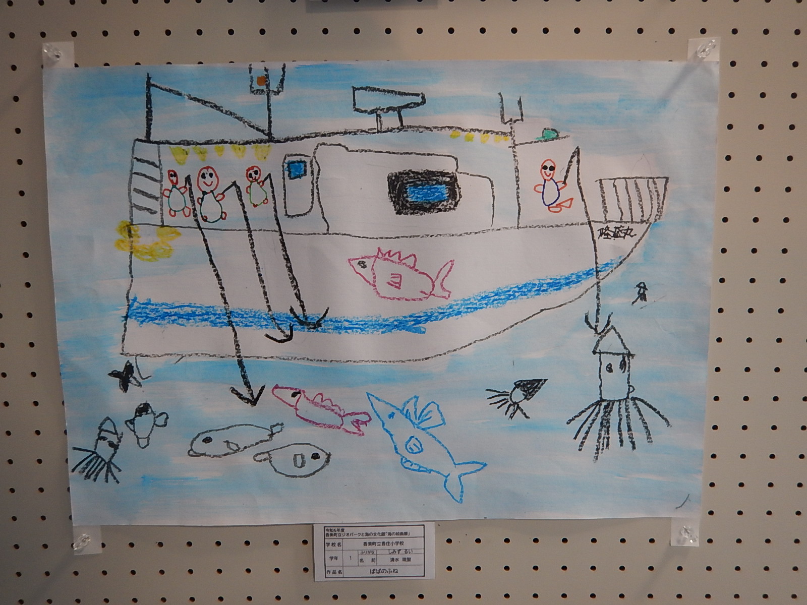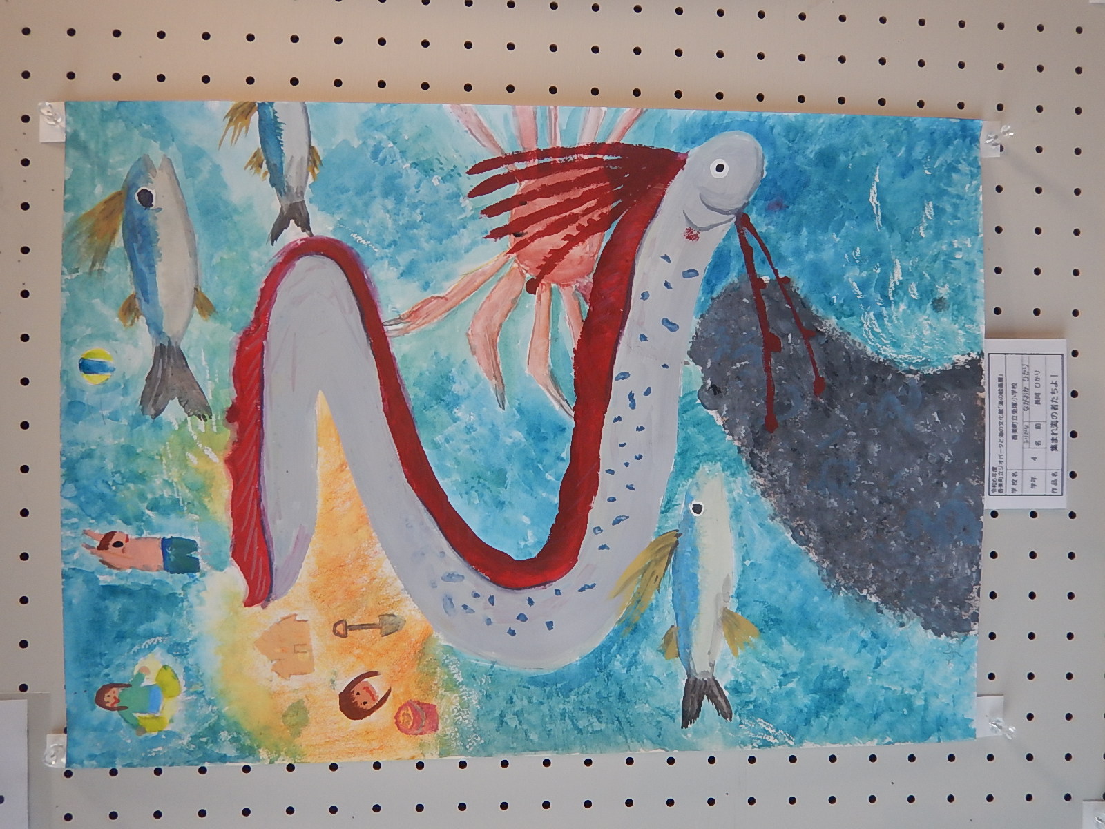 展示されている作品は、児童・生徒さんたちの目や心でとらえた魚や漁船、海の風景など想像力あふれるものばかりです。