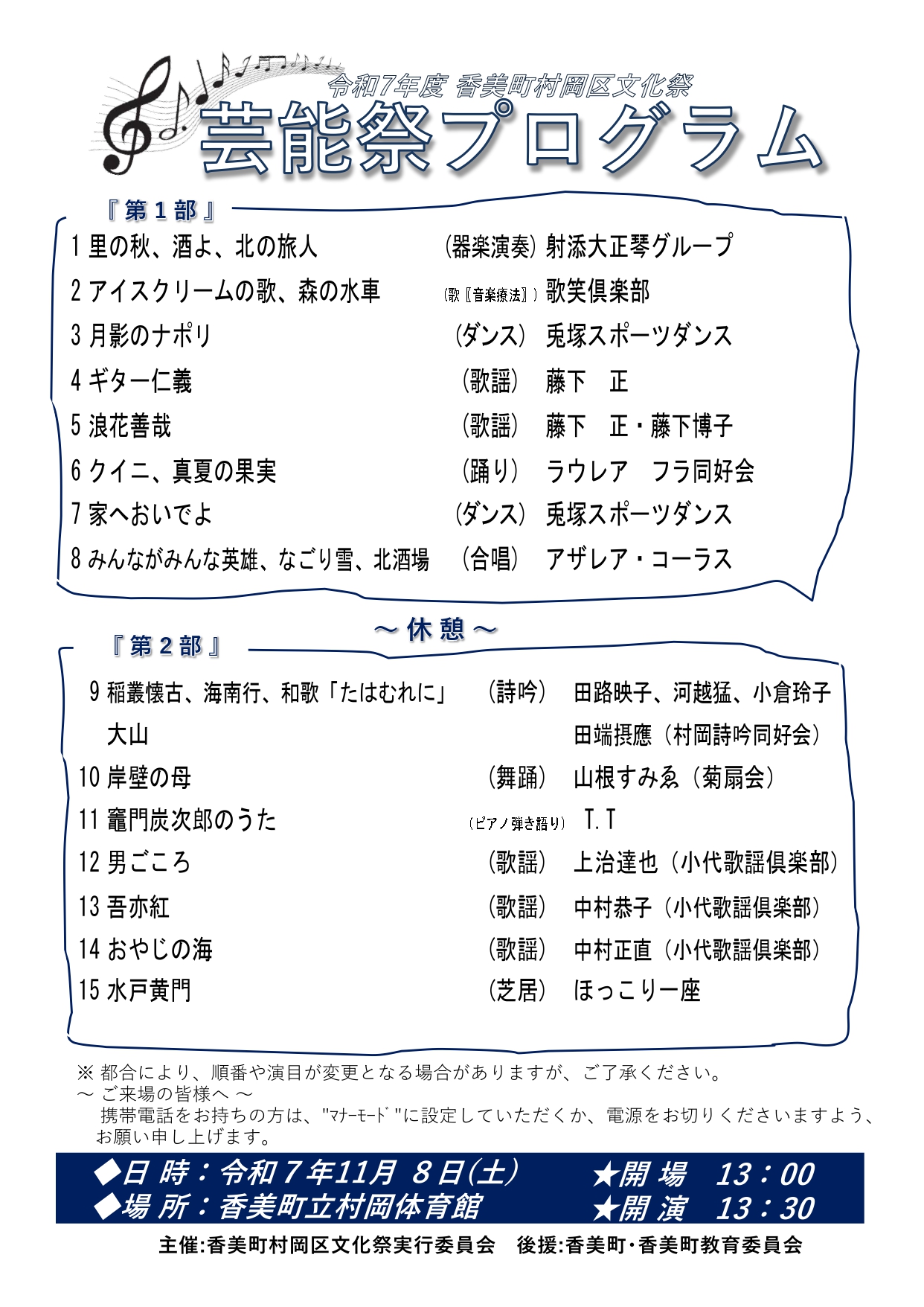 村岡区民の皆様はもとより、町内、また近隣の皆様も、ぜひお誘いあわせ、ご来場ください。