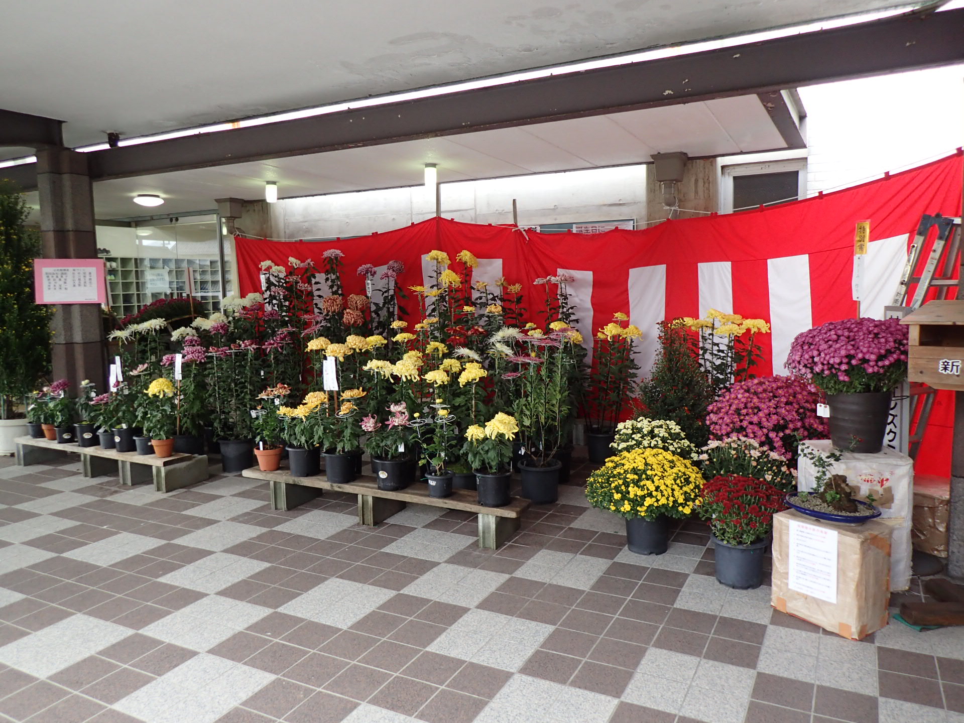 (玄関の菊、村岡区中央公民館玄関の生け花展示は5日(水)までの展示となります。)