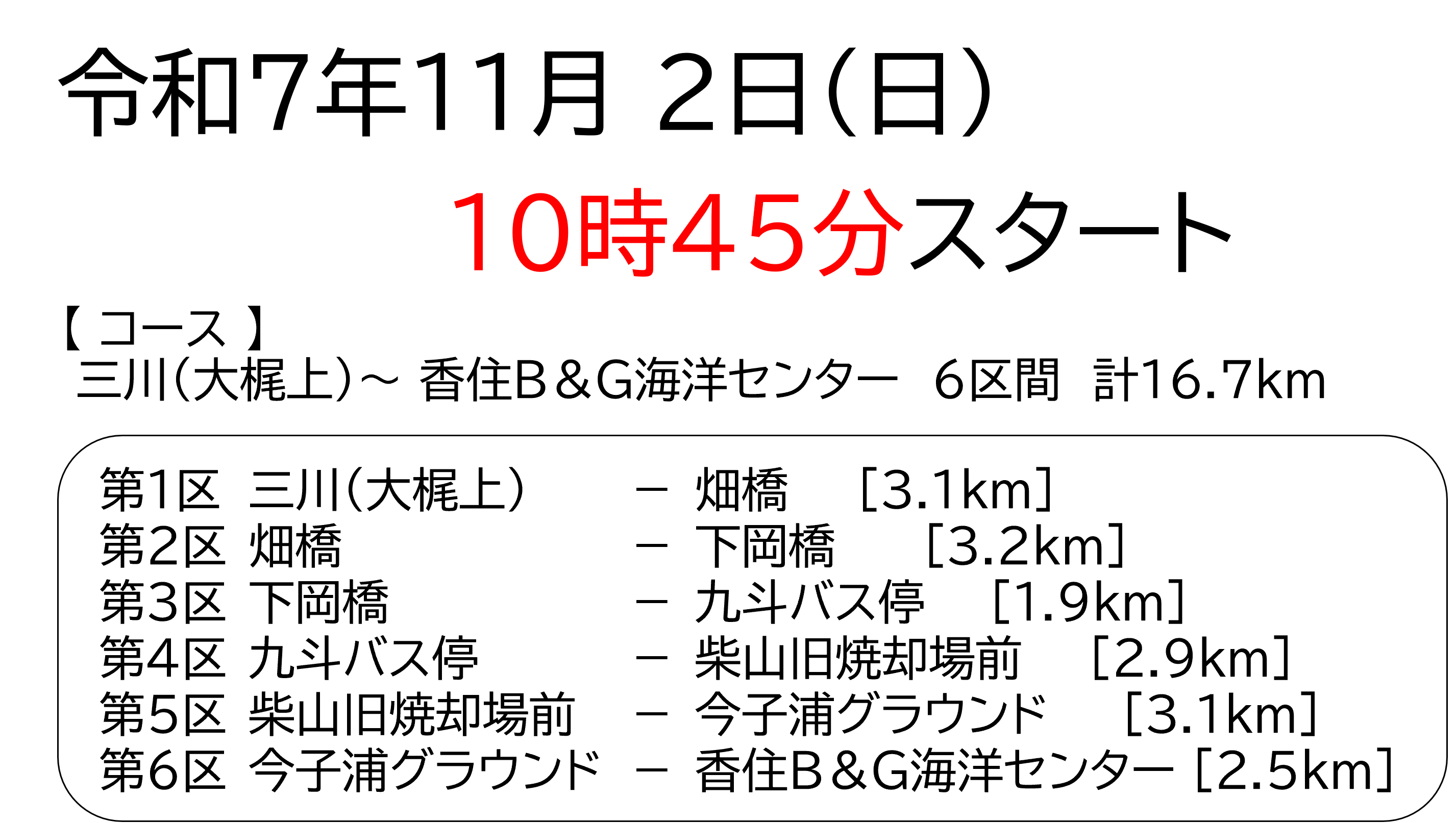11月2日(日)に、香住区三川から香住B&G海洋センターまでの約17kmを6区間に分けてリレーする第55回香美町駅伝競走大会を開催しました。