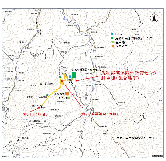 ⑺ トイレの場所は、スタート地点の兎和野高原野外教育センターとはちまき展望台の2カ所となっています。
