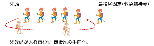 ⑷ 雪山登山は集団で行います。迷いそうな場所、危険カ所は引率スタッフが先導します。中間、最後尾にもスタッフを配置します。安全な場所