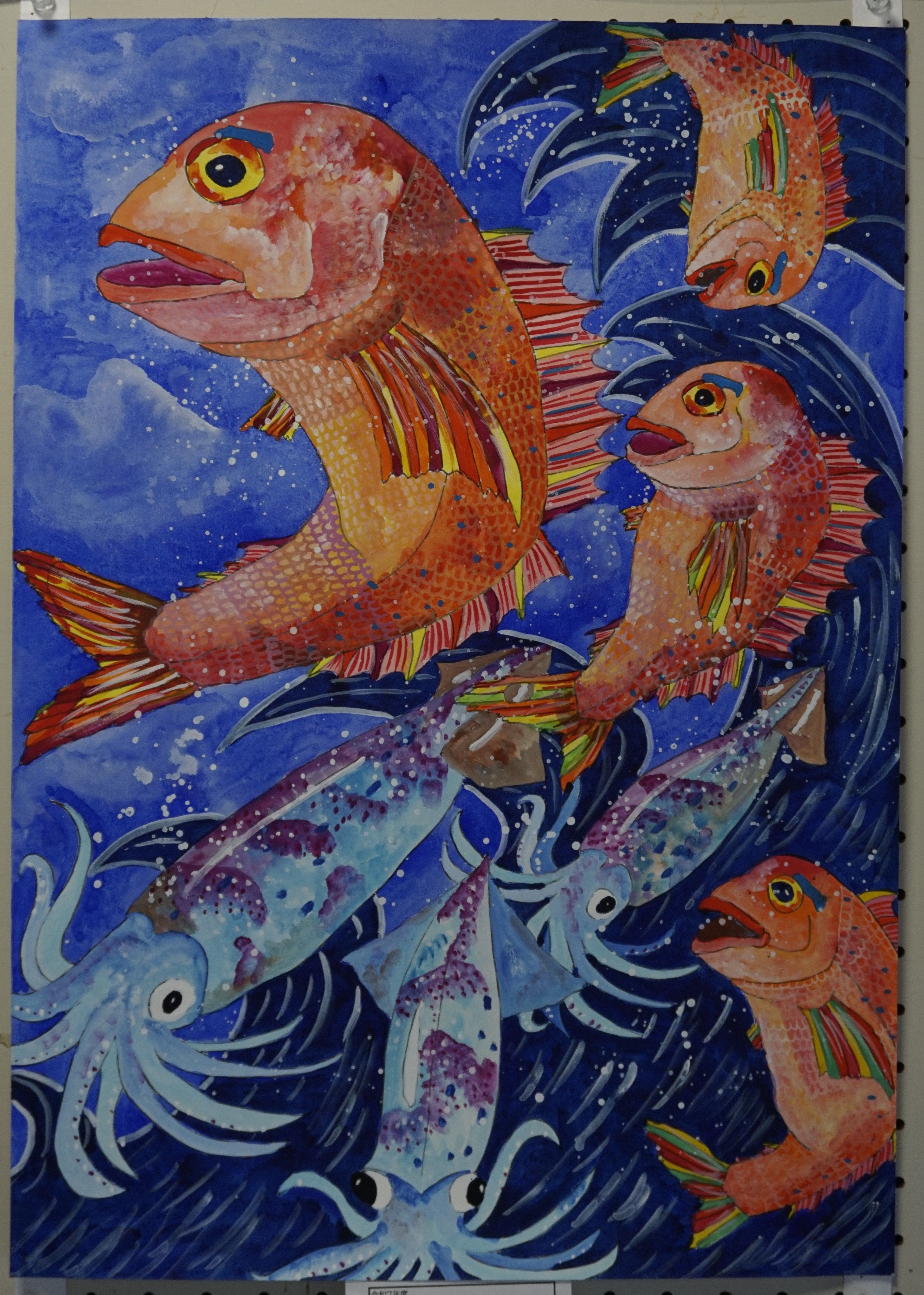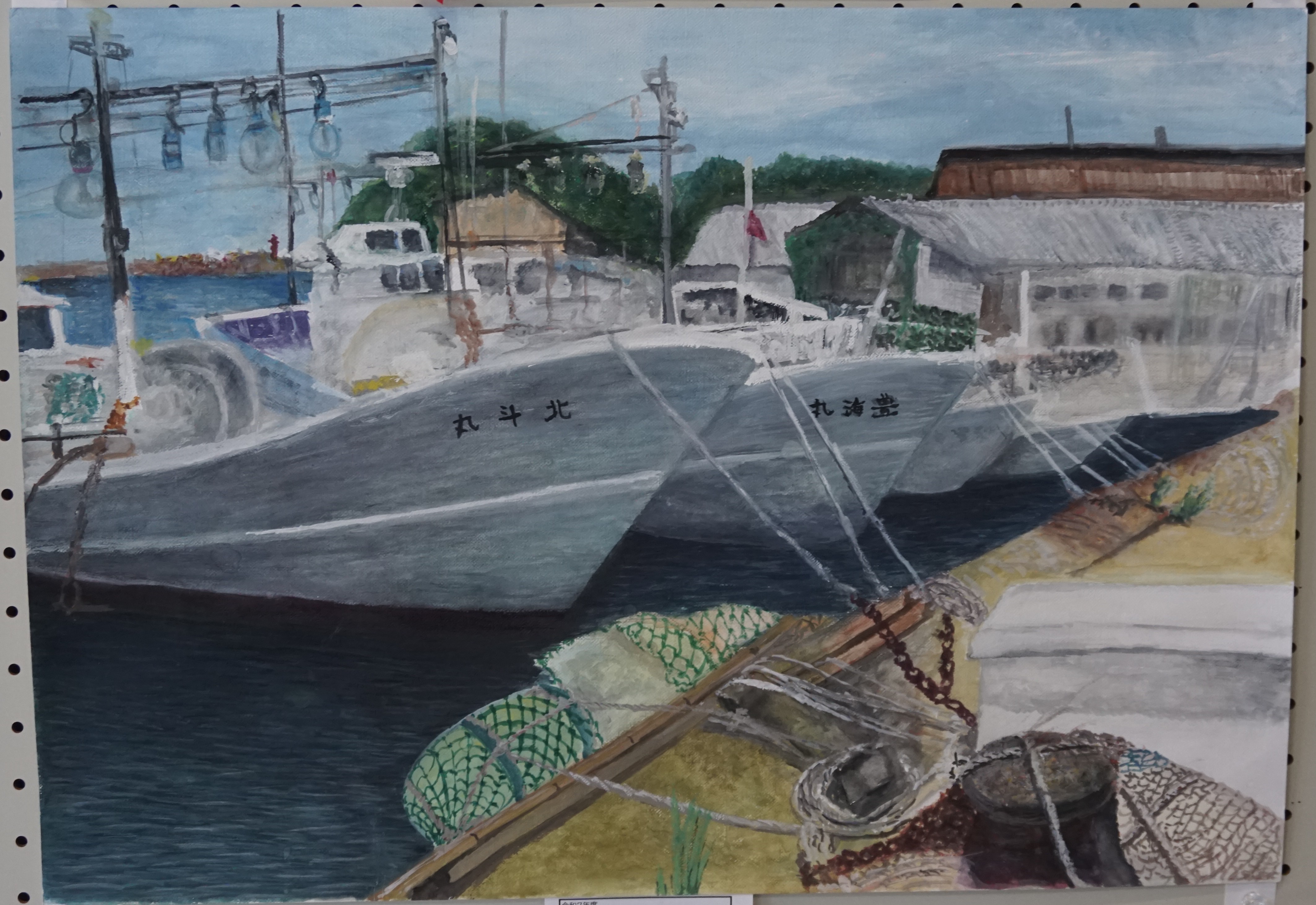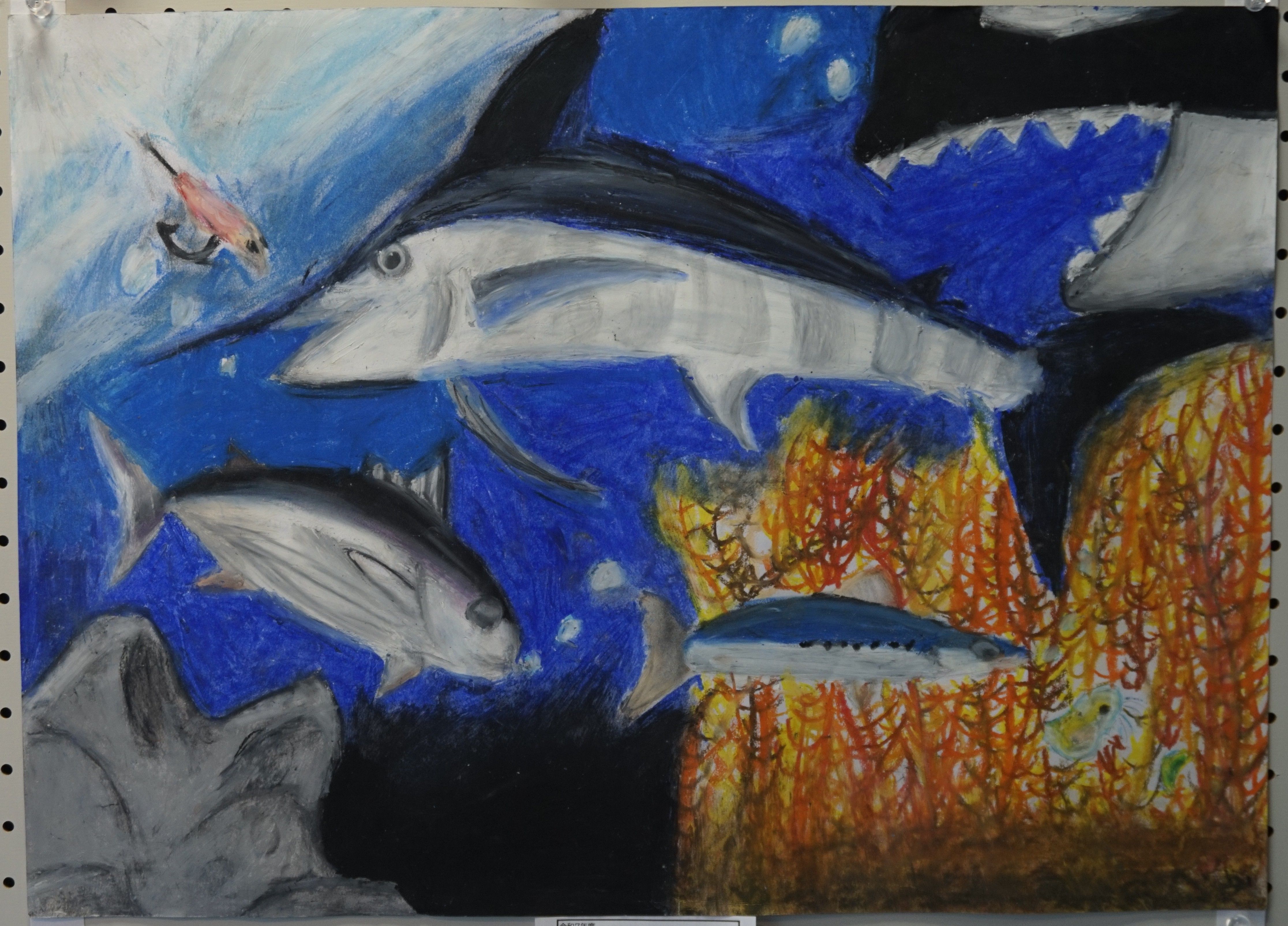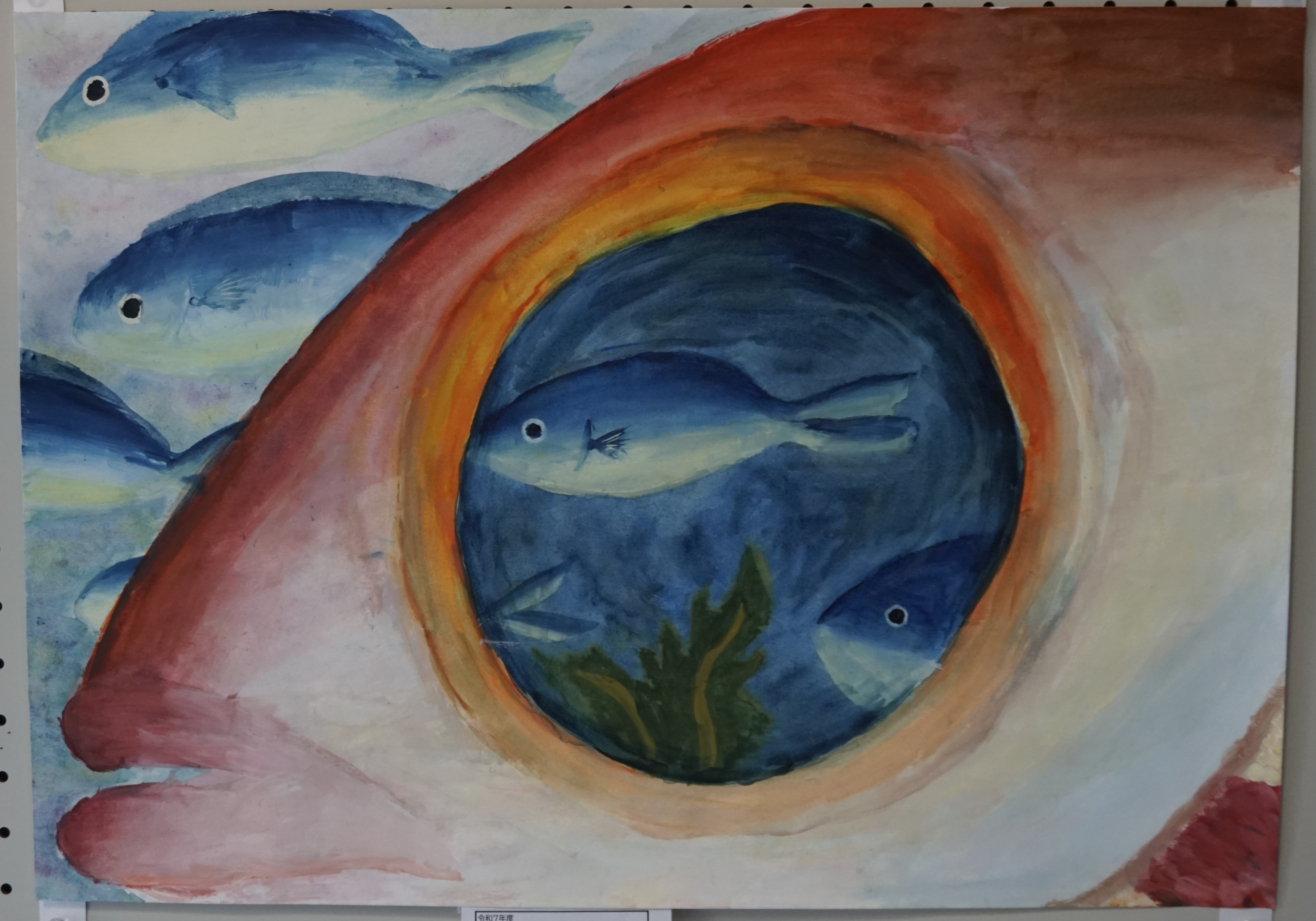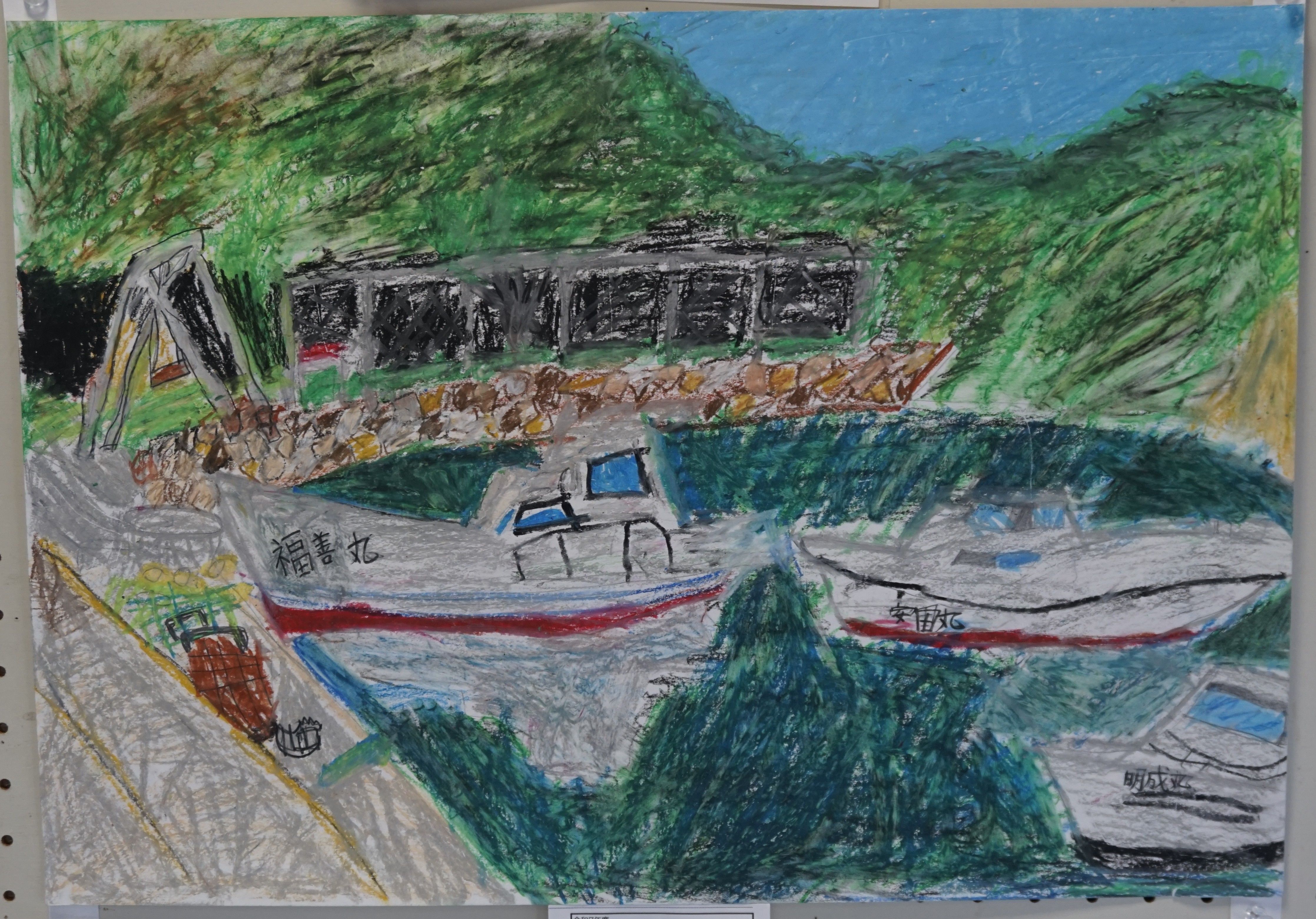 展示されている作品は、児童・生徒さんたちの目や心でとらえた魚や漁船、海の風景など想像力あふれるものばかりです。